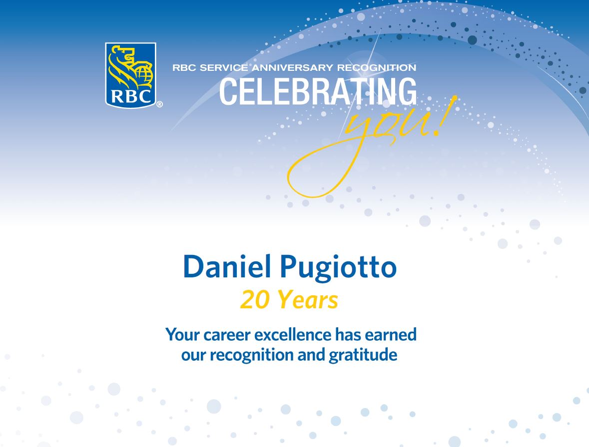 Bob Sautner, Etobicoke Branch Director, is pleased to recognize Daniel Pugiotto for providing professional wealth management and financial advisory services to investors and their families for the last 20 years. Daniel leads a team of professionals who are dedicated to clients’ financial success. Daniel is one of RBC Dominion Securities top Portfolio Managers – an achievement rewarded with a membership on the firm’s Executive Council. We, as a management team at the Etobicoke Branch, thank him for being part of our company's success over the years.
